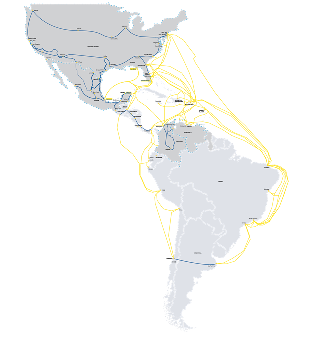 As a strategic hub in our network, Mexico plays a critical role in interconnecting Latin America with the U.S. and beyond. Our infrastructure spans major cities such as Mexico City, Monterrey, and Guadalajara, and includes key routes such as: